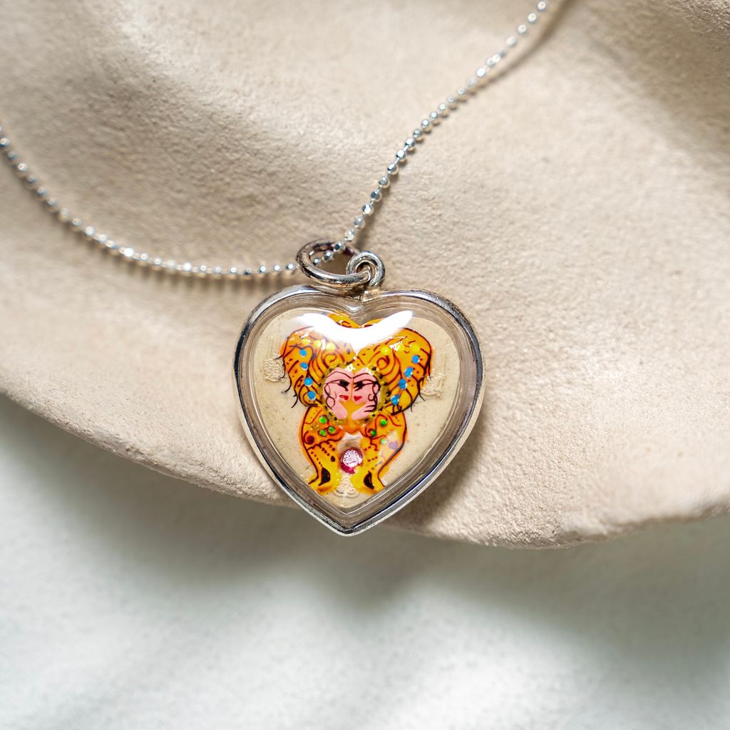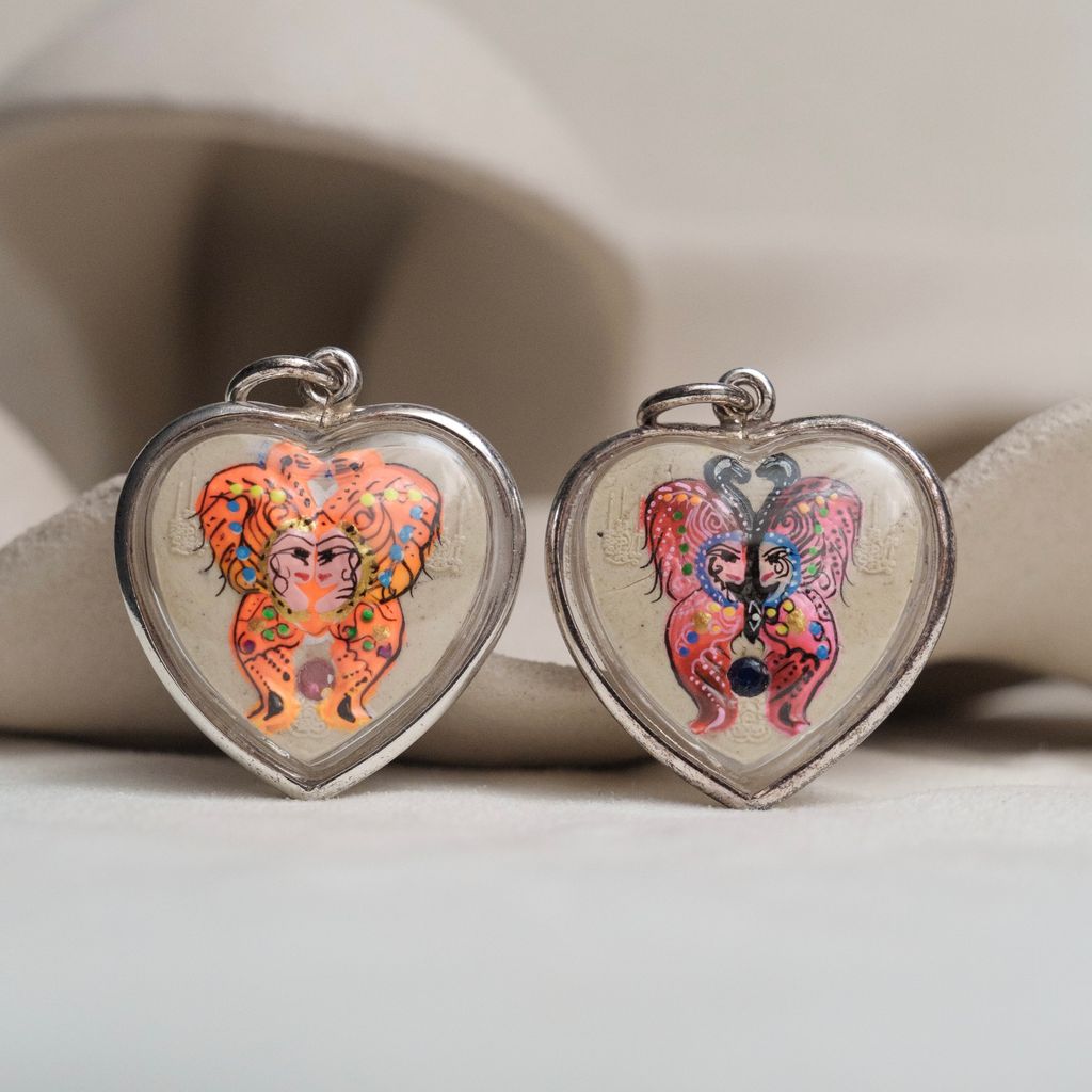 此種蝴蝶佛牌使用各款花粉與蝶王自己調配的香粉壓制而成,有令人人神往香味~還可以安神、定心,且香氣永久不滅,這也是此佛牌的特別之處。這種蝴蝶牌的正面一般是形狀類似蝴蝶的男女,後面習慣用一些泰國色彩寶石還有金屬片製成。